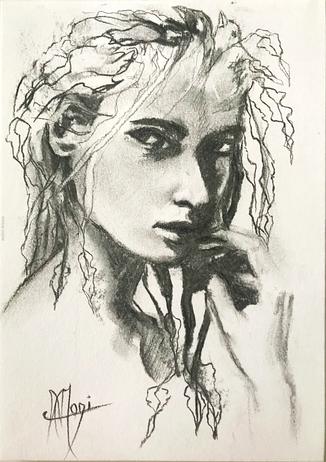 L’histoire des songes d’Athena : portrait au fusain moderne d’une jeune femme songeuse et très proche de la nature